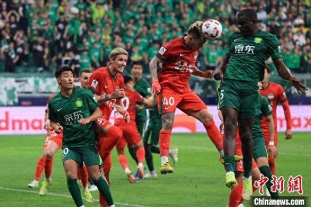 4月25日,在北京举行的2025赛季中国足球超级联赛第9轮比赛中,北京国安队主场1:0胜河南俱乐部酒祖杜康队。图为河南俱乐部酒祖杜康队球员纳萨里奥(右二)头球解围。中新社记者 田雨昊 摄